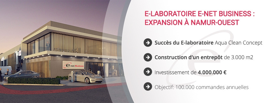 L’agence d’E-communication E-net dispose d’un "e-laboratoire" consacré à la vente de chiffons en microfibre par Internet : Aqua Clean Concept. Cette initiative vise à tester une foule de méthodologies en E-commerce. Le succès est énorme avec des pics de plus de 250 produits vendus par jour. Dans cette optique, E-net investit à l’Ouest de Namur pour développer plus encore son e-laboratoire : Construction d'un entrepôt e-commerce de 3 000 m² avec une empreinte écologique réduite et une automatisation poussée grâce à nos algorithmes et à l’avancée de l’intelligence artificielle (IA).